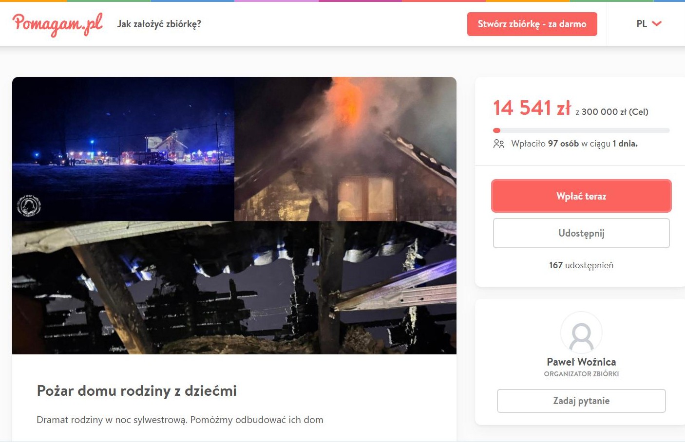 Poszkodowana rodzina znalazła się w kryzysowej sytuacji. – Przed nimi odbudowa domu, ale koszty remontu znacznie przekraczają ich możliwości finansowe. Dlatego uruchomiłem internetową zbiórkę pieniędzy. Każde wsparcie daje mojej siostrze i jej rodzinie nadzieję, że po tej tragedii będą mogli powoli stanąć na nogi i wrócić do normalnego życia – mówi pan Paweł. I apeluje do ludzi dobrej woli o wsparcie finansowe.