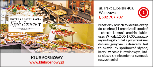 Niedzielny brunch to idealna okazja do celebracji i organizacji spotkań – chrzcin, komunii, urodzin i jubileuszy. W godz.12:00-17:00 zapraszamy na bogaty bufet z przystawkami, daniami gorącymi i i deserami. Jest to okazja, by spróbować słynnej kaczki w sosie żurawinowym, która cieszy się niezmienną sympatią naszych gości.