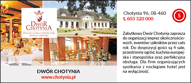 Zabytkowy Dwór Chotynia zaprasza do organizacji imprez okolicznościowych, eventów i pikników przez cały rok. Do dyspozycji gości są 4 sale, przestronny ogród, kuchnia europejska i staropolska oraz perfekcyjna obsługa. Dla firm organizujących spotkania z noclegiem hotel jest na wyłączność.