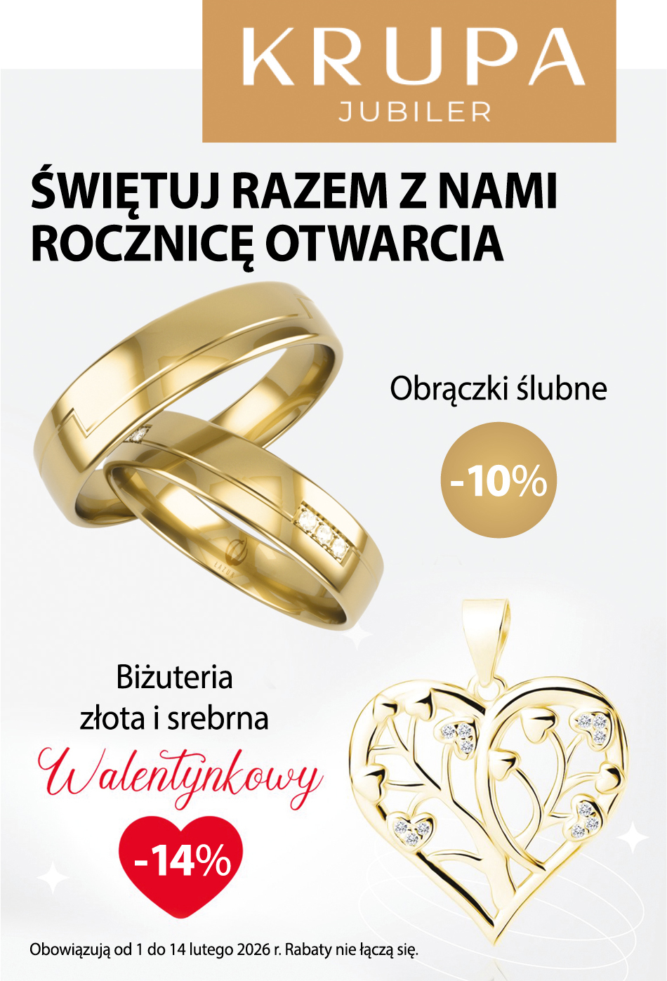 Z okazji rocznicy przygotowano promocję, która potrwa od 1 do 14 lutego. W tym czasie biżuteria złota i srebrna objęta jest 14% rabatem, natomiast obrączki ślubne – 10% zniżką. To propozycja zarówno dla osób poszukujących prezentu walentynkowego, jak i dla tych, którzy planują zakup biżuterii na dłużej i chcą postawić na jakość oraz sprawdzoną próbę złota.