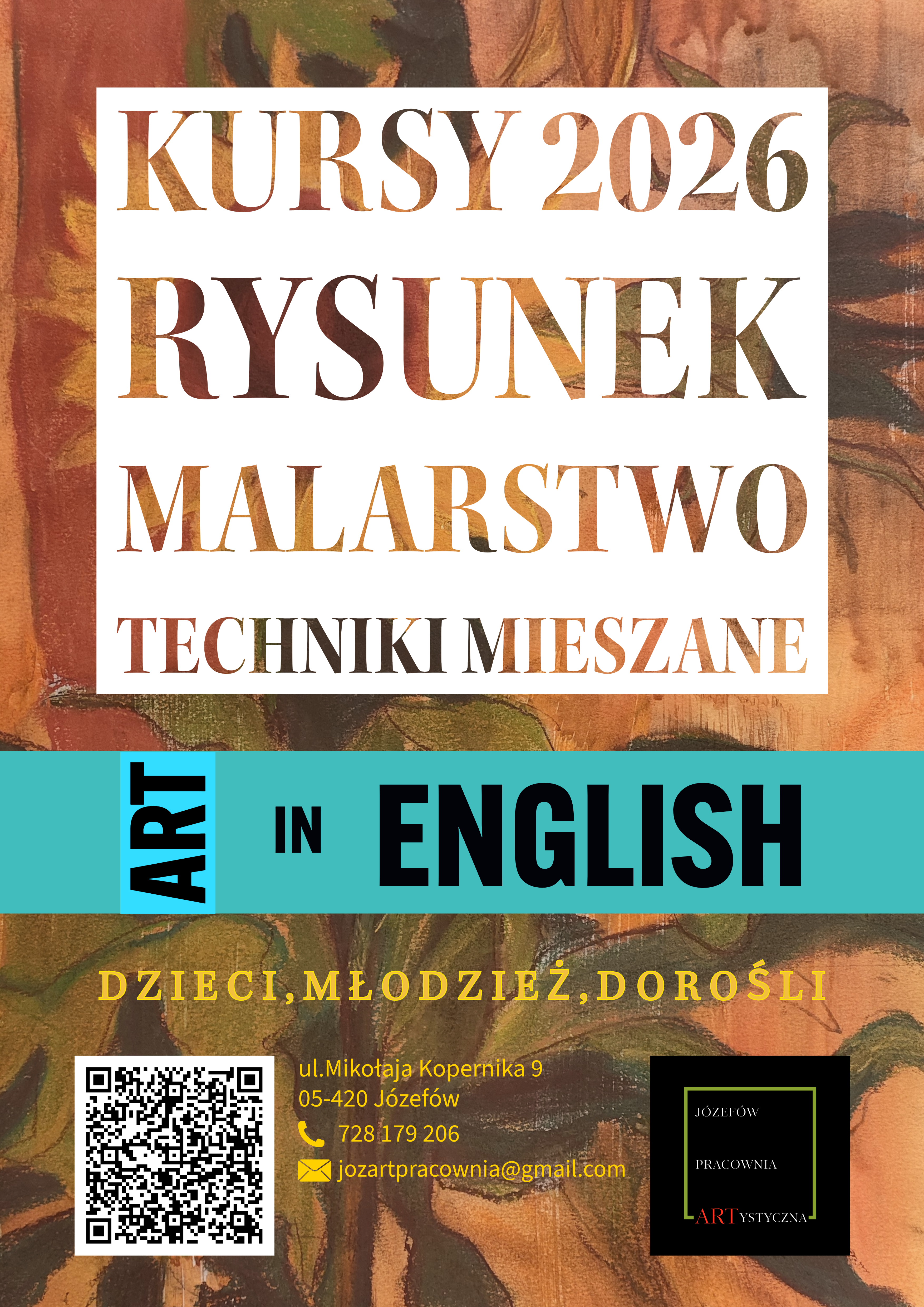 Zapraszamy dzieci, młodzież i osoby dorosłe na zajęcia rysunku, malarstwa oraz technik mieszanych w języku angielskim (w ofercie także dostępne kursy w języku polskim). Józefów Pracownia Artystyczna jest miejscem nastrojowym, w którym można zapomnieć o problemach i zachwycić się pasją tworzenia, a przy tym w naturalny, bezstresowy sposób uczyć się języka angielskiego, co w dzisiejszym świecie każdemu się przyda.