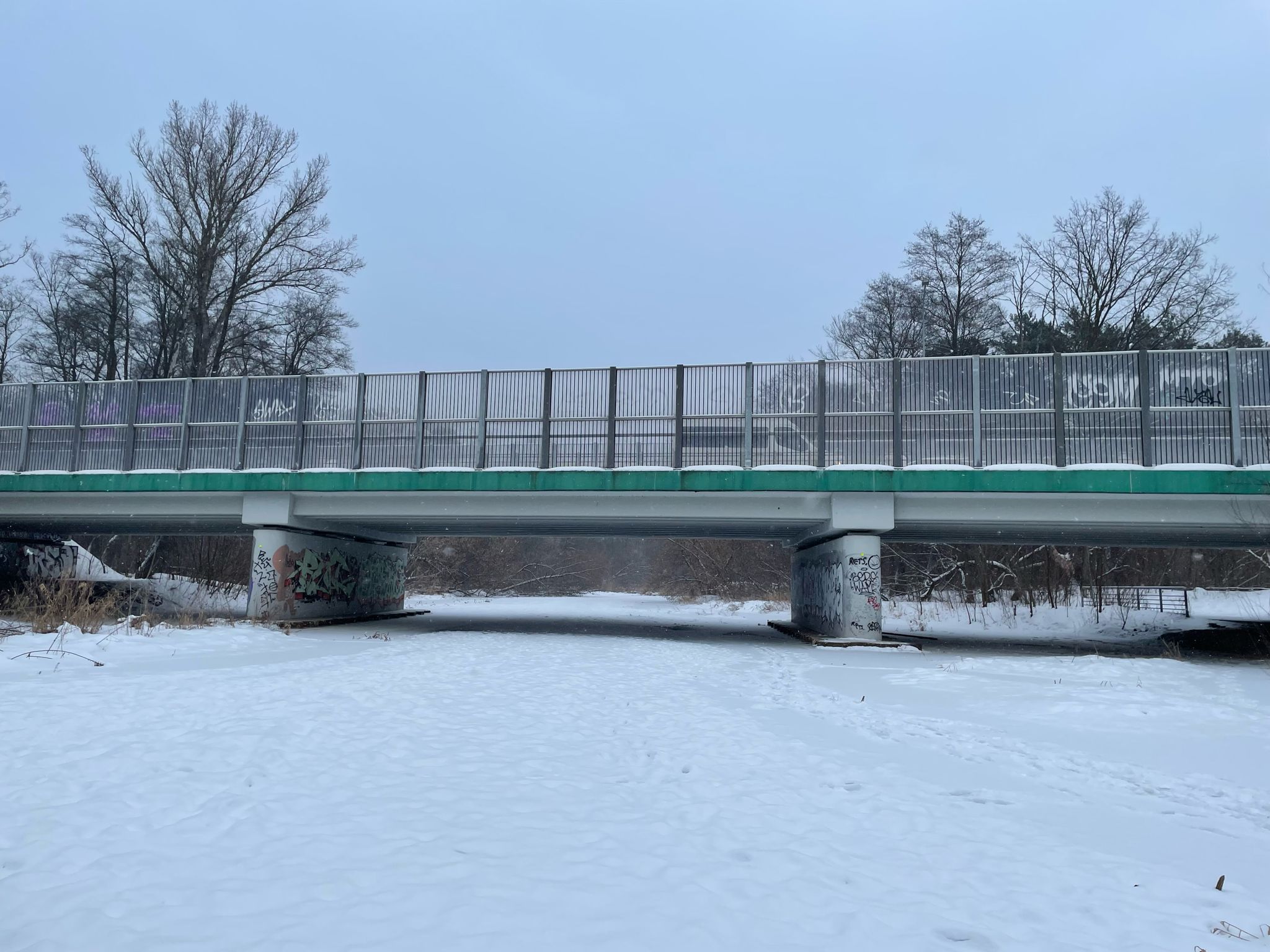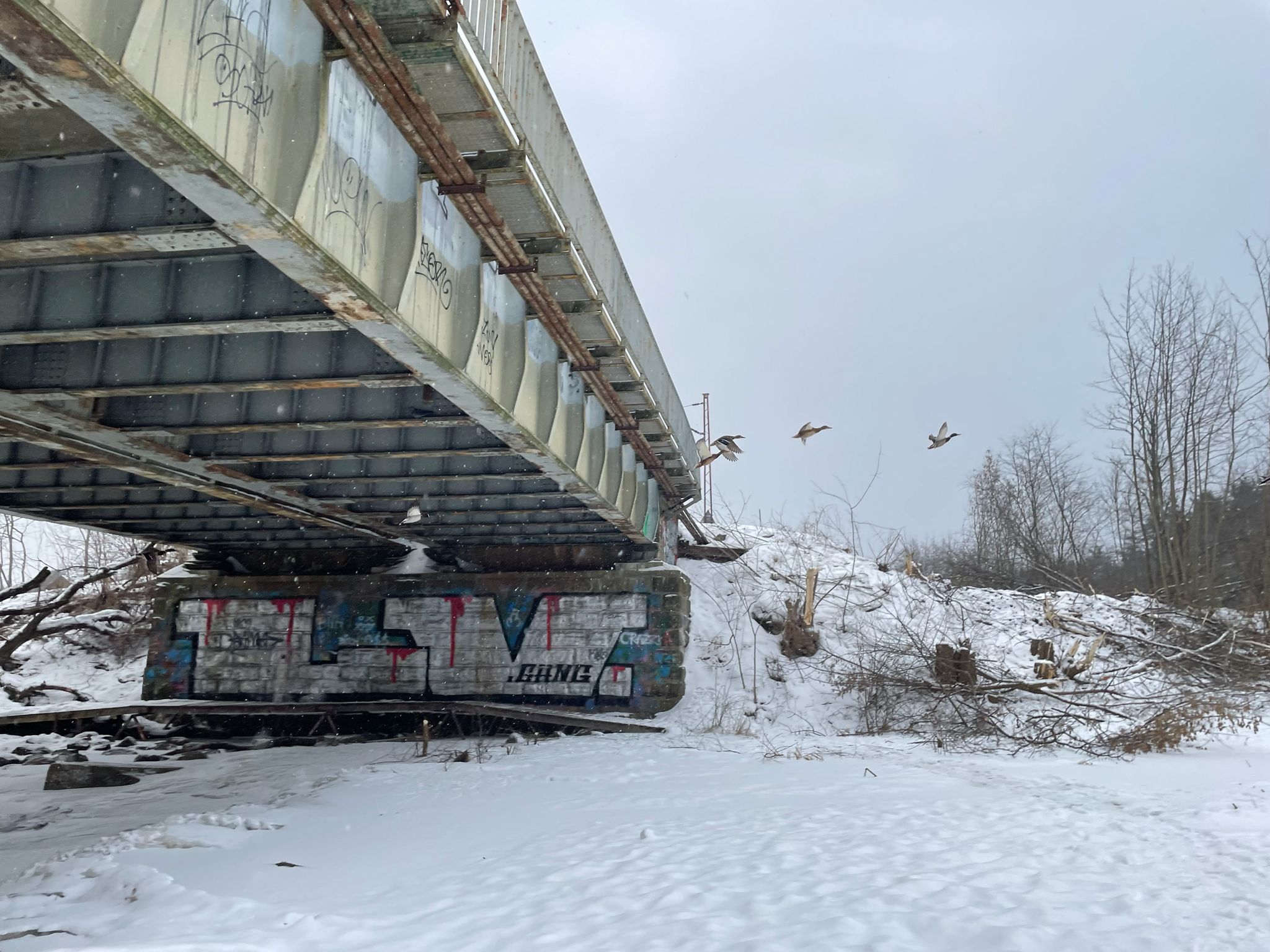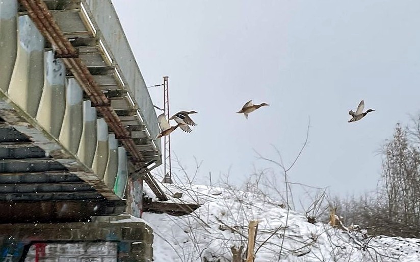 Mroźna aura daje się we znaki nie tylko mieszkańcom, ale i zwierzętom. Pod mostem kilka gołębi znalazło schronienie przed przeszywającym wiatrem, chowając się w zaciszu betonowych konstrukcji. Z kolei na rzece, mimo lodu i śniegu, wciąż można dostrzec kaczki, które trzymają się nie zamarzniętych fragmentów nurtu.