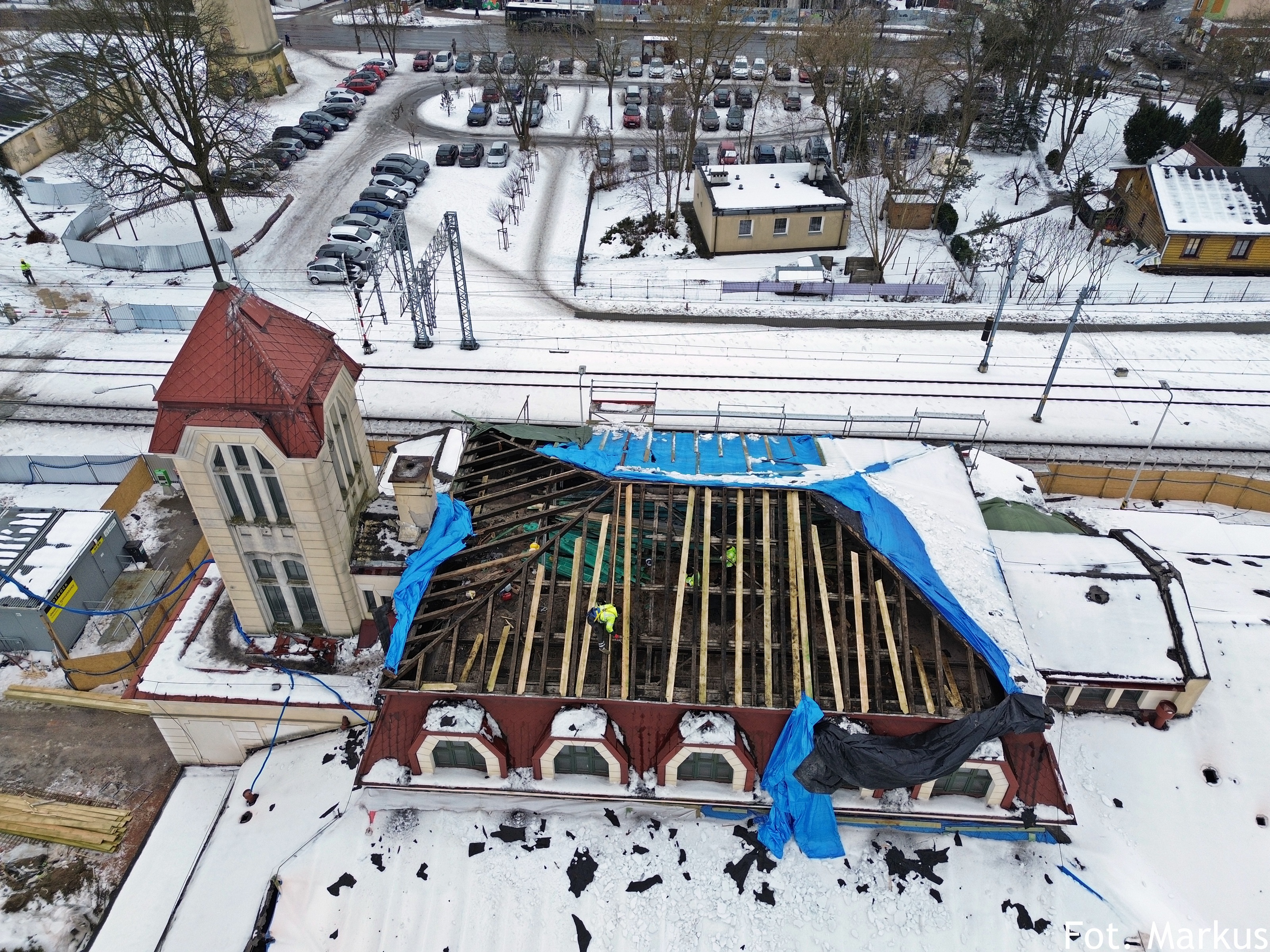 Jak już wiecie z „Przeglądu” dworzec zmieni się także wewnątrz. W budynku prowadzony jest gruntowny remont wszystkich pomieszczeń, w tym zaplecza pracowniczego. Ze ścian usunięto m.in. stare płytki, przygotowując powierzchnie do dalszych prac. Wokół obiektu wykonano również roboty przy fundamentach. Odnawiany jest także charakterystyczny drewniany sufit. Prace prowadzone są również na dachu, gdzie wykonawca zdemontował stare pokrycie. – Wewnątrz budynku zaplanowano przestronny hol z ławkami, pomieszczenia kas biletowych z zapleczem, elektroniczne tablice przyjazdów i odjazdów pociągów, ogólnodostępne toalety, lokale do wynajęcia oraz pomieszczenie do zagospodarowania, np. na czytelnię – wyjaśnia inwestor.
