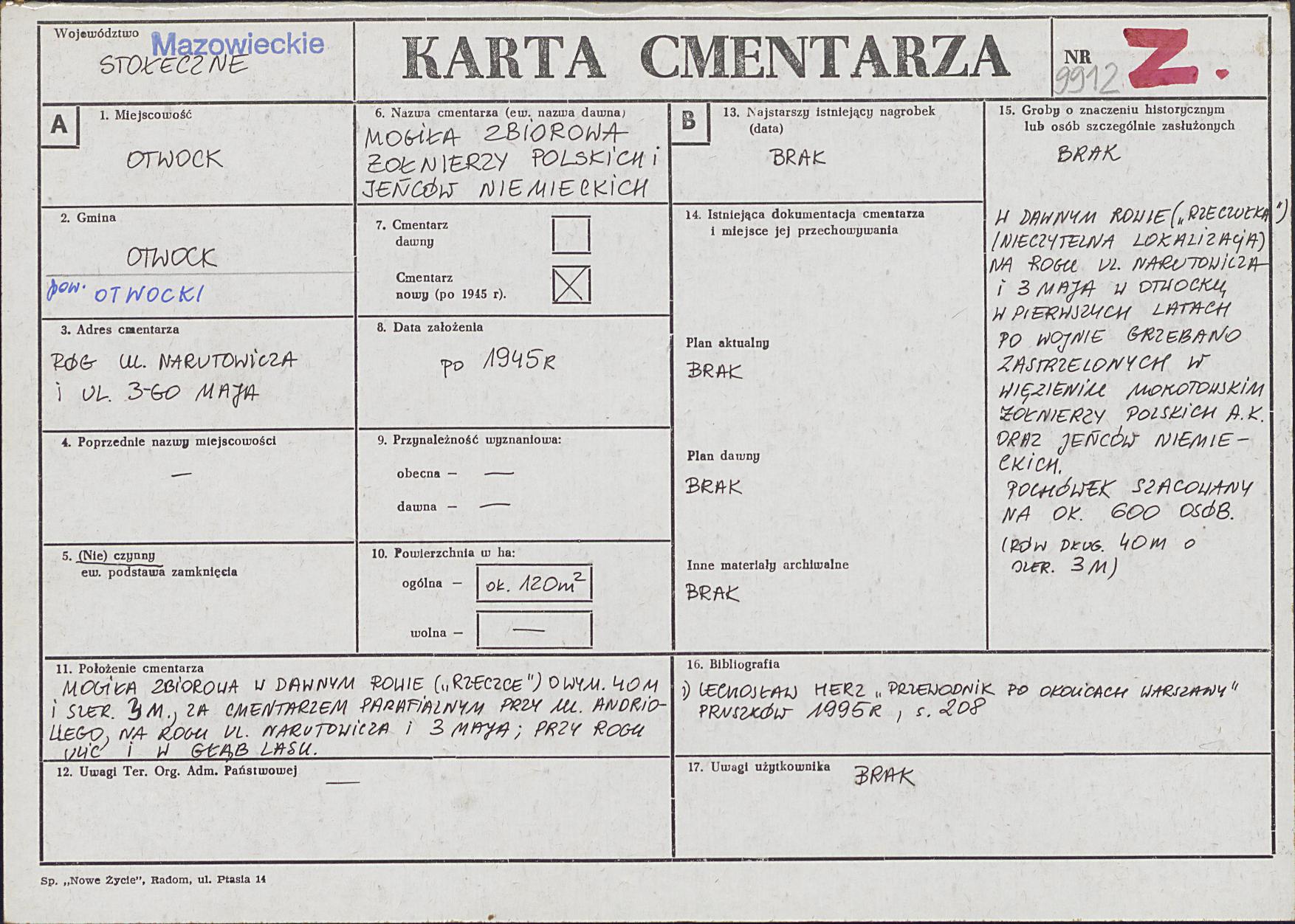 W Karcie Cmentarza zapisano, że chodzi o „mogiłę zbiorową żołnierzy polskich i jeńców niemieckich” zlokalizowaną w dawnym rowie („rzeczce”) na rogu ulic: Narutowicza i 3 Maja w Otwocku (i w głąb lasu). W ręcznym opisie wskazano, że w pierwszych latach po wojnie grzebano tam „zastrzelonych w więzieniu mokotowskim żołnierzy polskich A.K. oraz jeńców niemieckich”. Miejsce pochówku opisano jako rów o długości ok. 40 metrów i szerokości ok. 3 metrów, który zlokalizowano za cmentarzem parafialnym (ul. Andriollego).