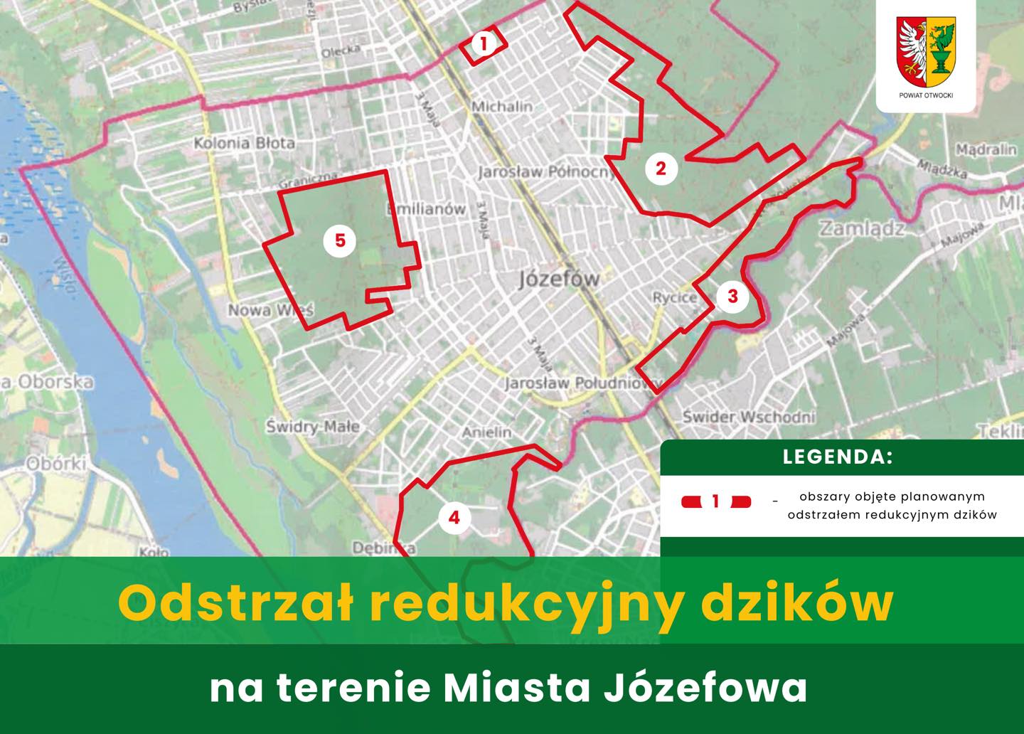 Starostwo wyznaczyło pięć stref w granicach Józefowa, gdzie myśliwi będą mogli strzelać do dzików. Obejmują one głównie obrzeża miasta, okolice trasy 801, terenów wzdłuż rzeki Świder i ulic położonych bliżej lasu. Specjalnie dla Czytelników publikujemy ulice (i ich okolice) gdzie wyznaczono strefy odstrzału.