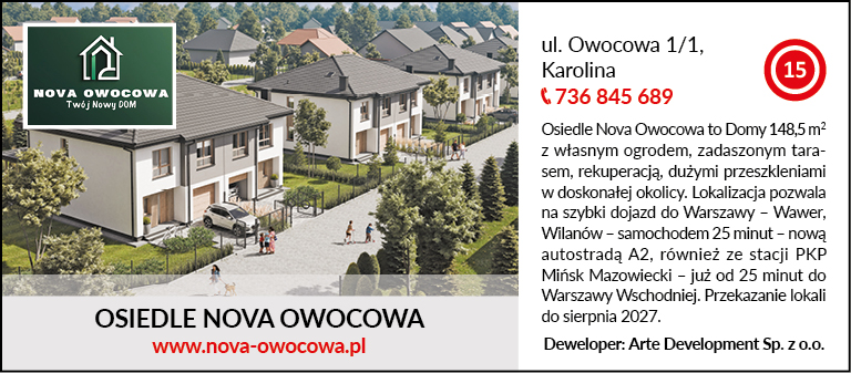Osiedle Nova Owocowa to Domy 148,5 m2 z własnym ogrodem, zadaszonym tarasem, rekuperacją, dużymi przeszkleniami w doskonałej okolicy. Lokalizacja pozwala na szybki dojazd do Warszawy – Wawer, Wilanów – samochodem 25 minut – nową autostradą A2, również ze stacji PKP Mińsk Mazowiecki – już od 25 minut do Warszawy Wschodniej. Przekazanie lokali do sierpnia 2027.