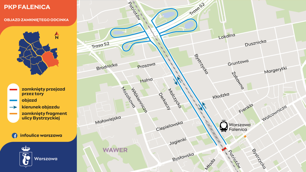 Zalecany objazd dla kierowców poprowadzono przez węzeł na trasie S2. Jak zapewnia inwestor, PKP PLK na ulicach: Patriotów, Młodej, Bysławskiej i Walcowniczej będą ustawione tablice kierujące kierowców do węzła z Południową Obwodnicą Warszawy.