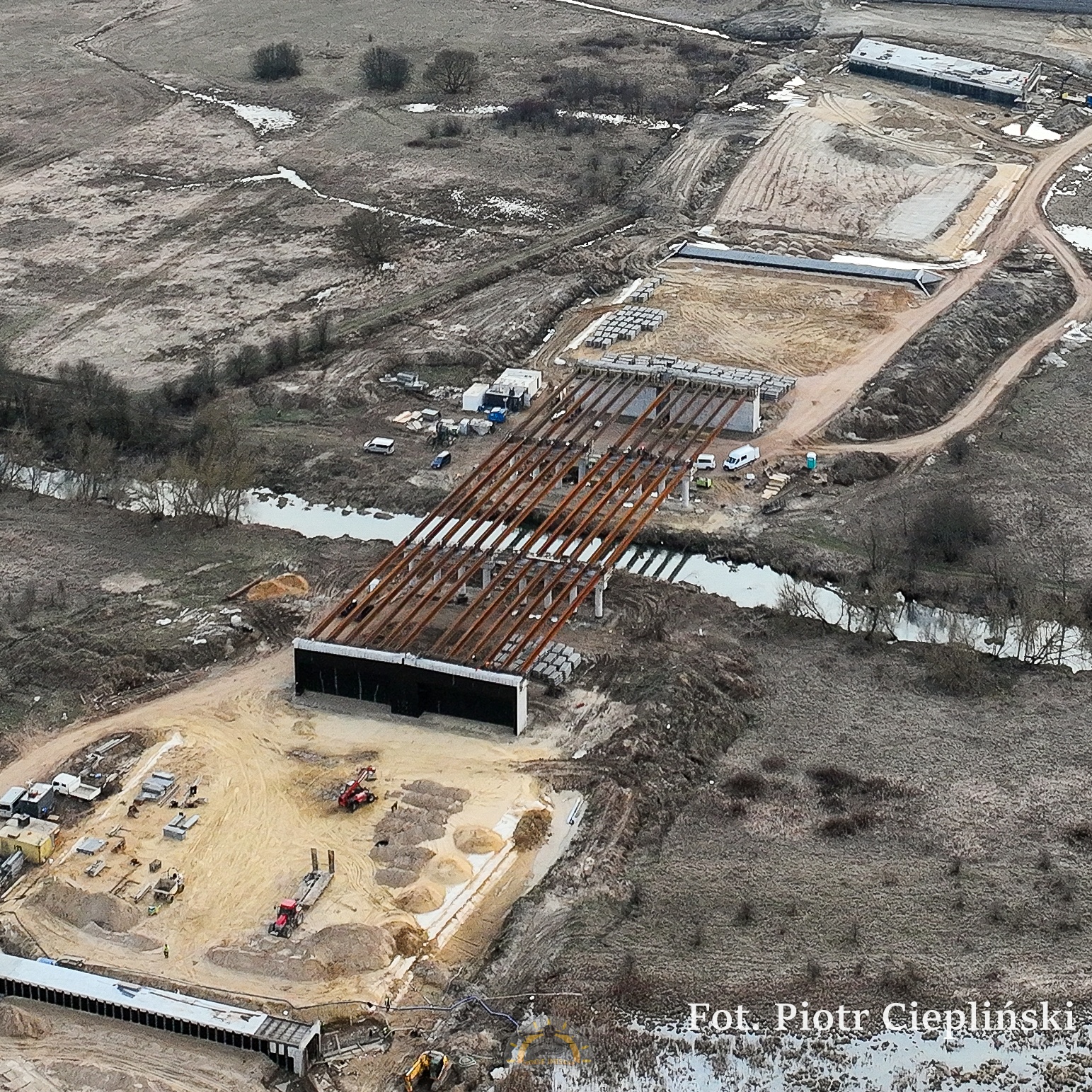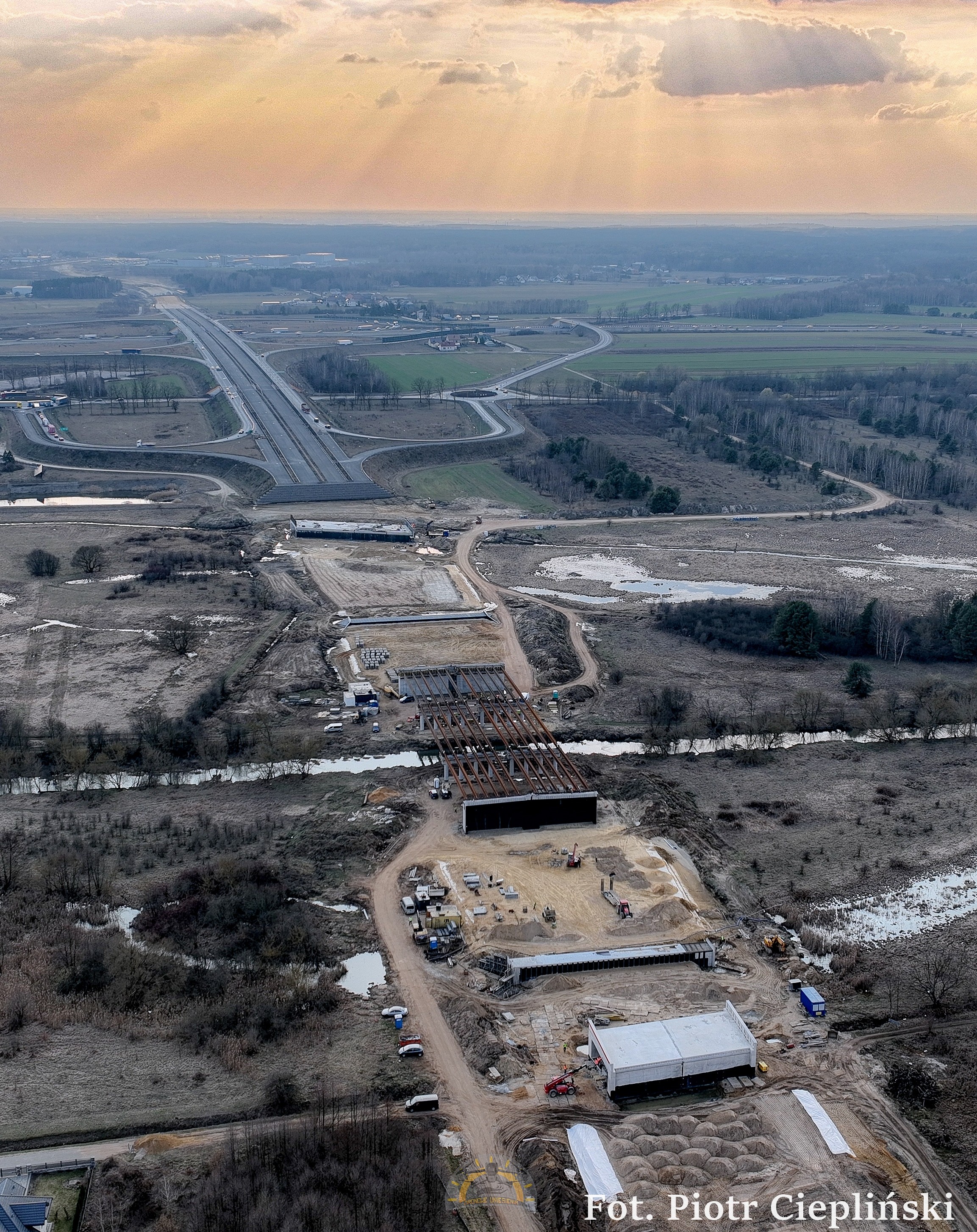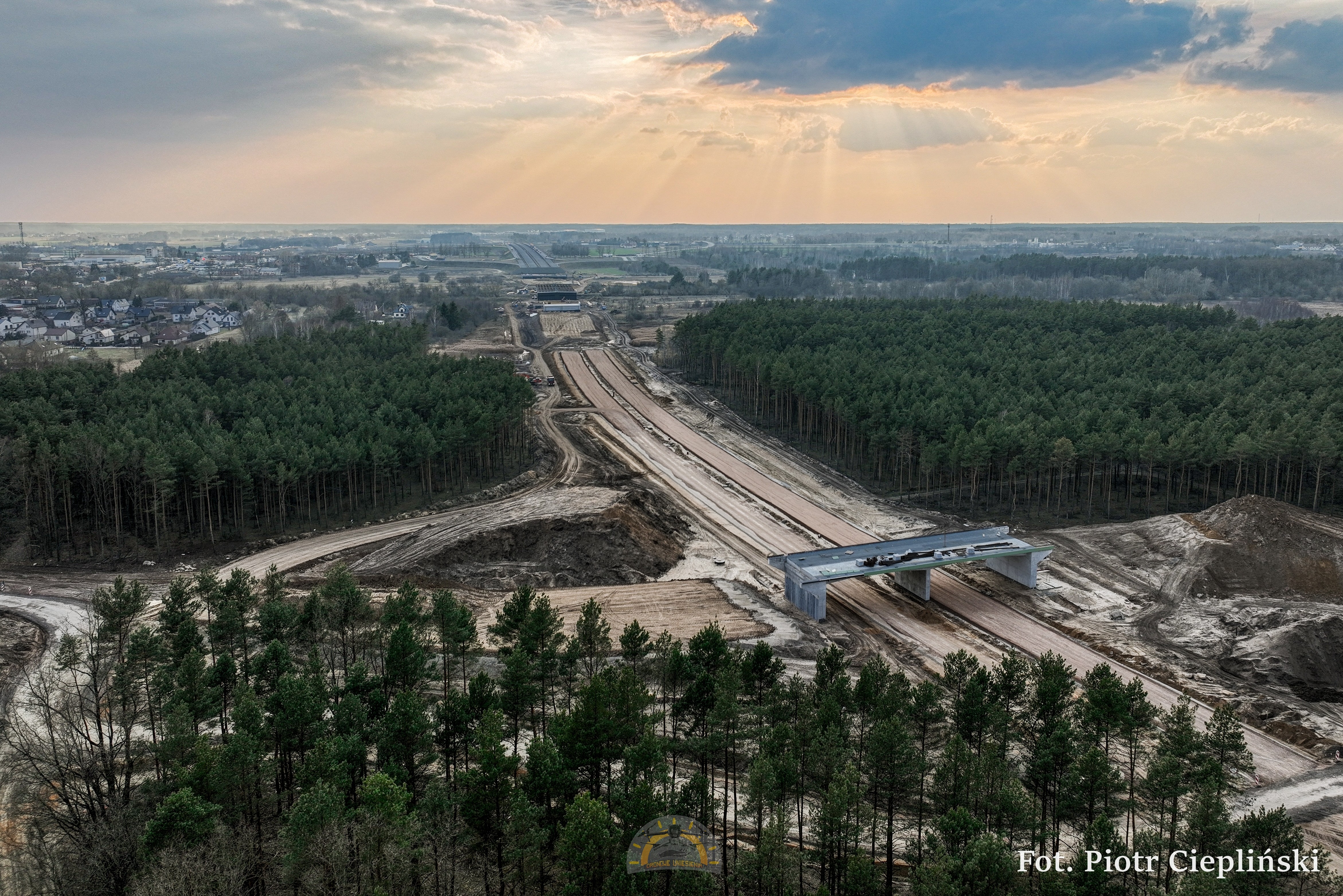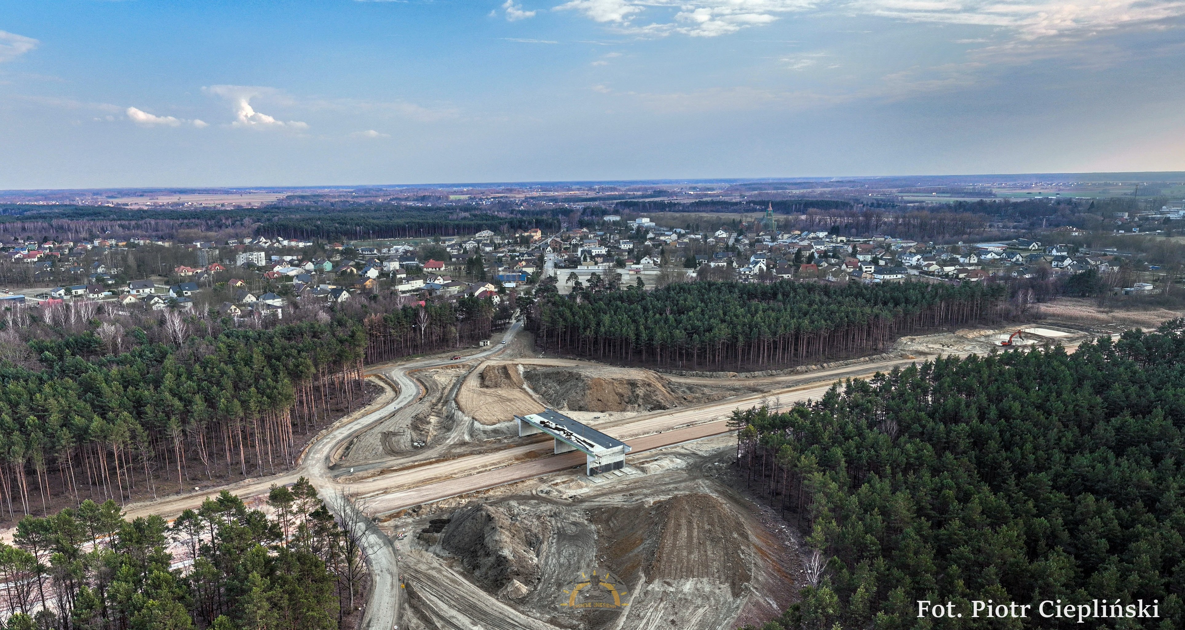 Budowa obwodnicy Kołbieli to jedna z najważniejszych inwestycji drogowych w tej części powiatu, która odciąży okolicę od ruchu tranzytowego. Prace rozpoczęły się pod koniec 2024 roku i od tego czasu mocno przyspieszyły. Obecnie wykonawca zrealizował już ponad 40 proc. inwestycji. Na placu budowy wykonano szeroki zakres robót ziemnych i odwodnieniowych, a także trwa budowa obiektów inżynieryjnych. Postęp prac z lotu ptaka uchwycił jeden z mieszkańców, Piotr Ciepliński.